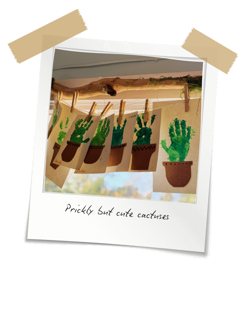 One of our favorite creations used our handprints to create cactuses. However, it was much more fun painting tables, paper and each other with little green hands.